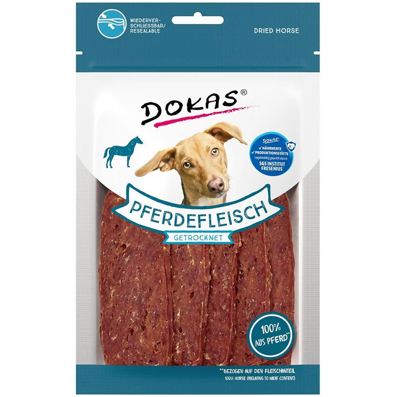 Dokas skiver af hest. Premium godbidder fremstillet af skånsomt tørret hestekød. Lækre skiver, som er særdeles velegnede som en smagfuld godbid mellem måltiderne. Skiverne er også ideelle til hunde med følsom mave og fordøjelse.