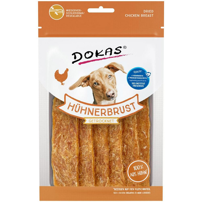 Dokas tørrede kyllingebrystskiver. Premium godbid af hel kyllingebryst skåret i tynde skiver. Skånsomt lufttørret og lav på fedt.