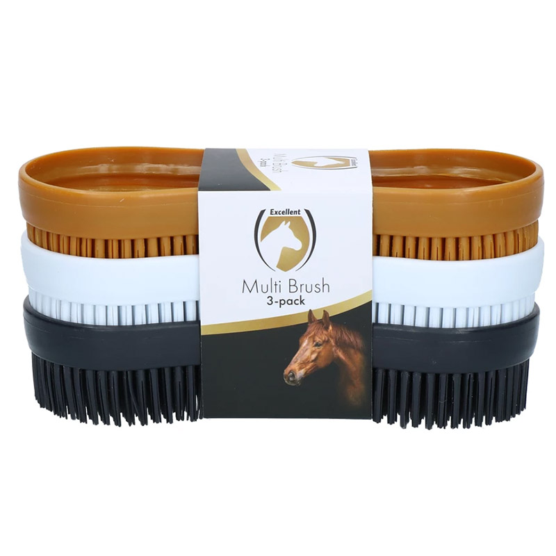 Excellent Horse Multi Brush 3-pak er den ideelle løsning til effektiv pleje af din hest. Disse alsidige børster fjerner nemt snavs, sved og løse hår – helt uden at irritere huden. De er skånsomme mod følsomme områder som ben, hoved og bug, og kan bruges på både våd og tør pels.