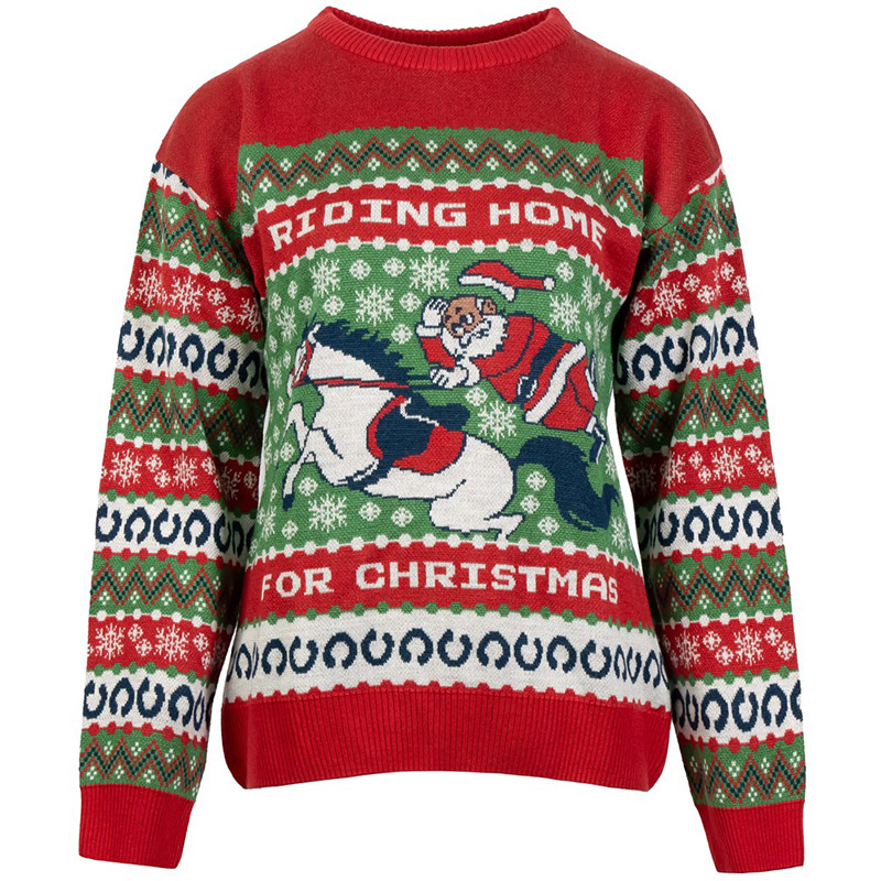 Gør juletiden endnu hyggeligere med denne hylende morsomme, “grimme” juletrøje! Julemanden lader sin kane stå og hopper i stedet op på en hest, der virkelig “rider hjem til jul”. Perfekt til at stjæle opmærksomheden ved julefrokoster, familiefester eller på “grim juletrøje”-dagen på arbejdet. Behagelig og varm – ideel til kolde vinterdage. En ægte blikfang med humoristisk design. Et must-have for alle, der fejrer julen med et glimt i øjet!