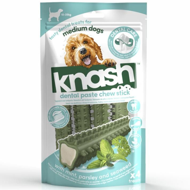 Knash Dental Paste Chew Sticks med tandpasta til hunde. Lækre og unikt formede tyggesticks med kylling, spækket med velsmagende grøntsager og uden tilsatte kunstige farve- eller smagsstoffer. Med hørfrøolie, der indeholder omega 3- og 6-fedtsyrer, der fremmer sund hud og pels og og med calcium til knogler og tænder.