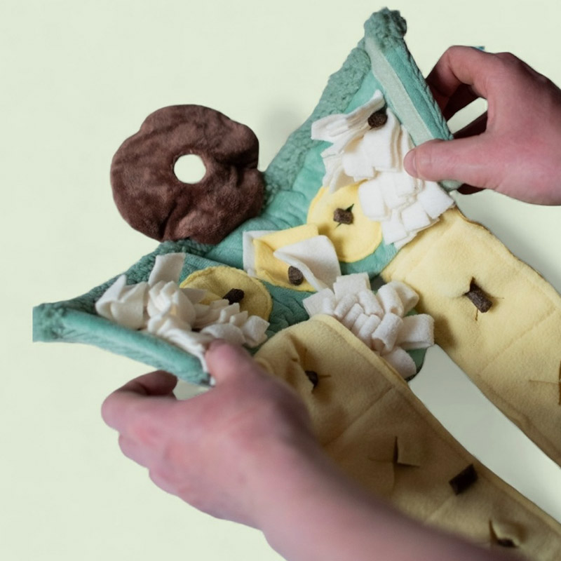 Fold snuseplanten ud, fyld lommer og folder med godbidder: Fold planten op igen og lad nu din hund selv finde ud af at folde planten ud og finde godbidderne i de mange spændende gemmesteder.